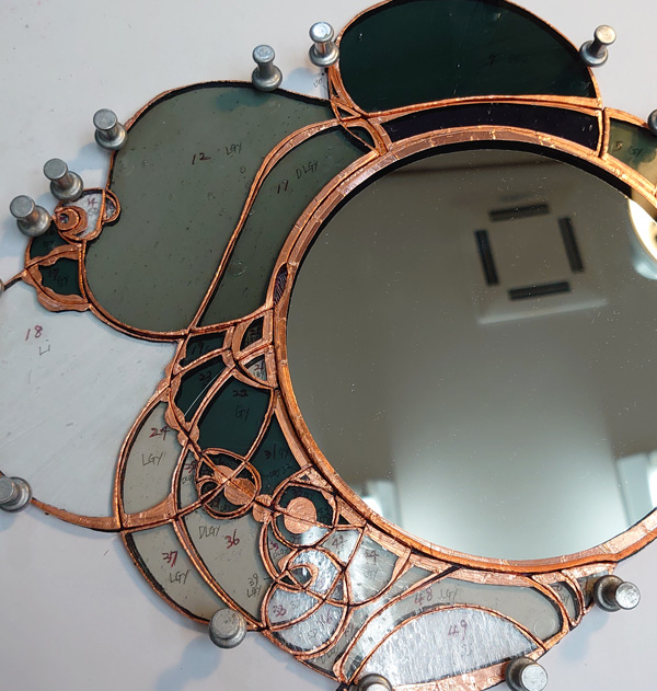 作業の流れは、両端45度に切ったチャンネルで4辺を囲み、ホースネイル(馬蹄釘)で位置を固定し、コーナーをハンダでとめ、ガラスとチャンネルの隙間をシリコンコーキングする。